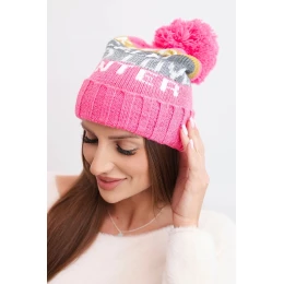 Dámská zimní čepice s vlnou a nápisem s velkým bambulí K422 světle růžová