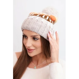 Dámská zimní čepice s vlnou a nápisem s velkým pomponem K422 béžová