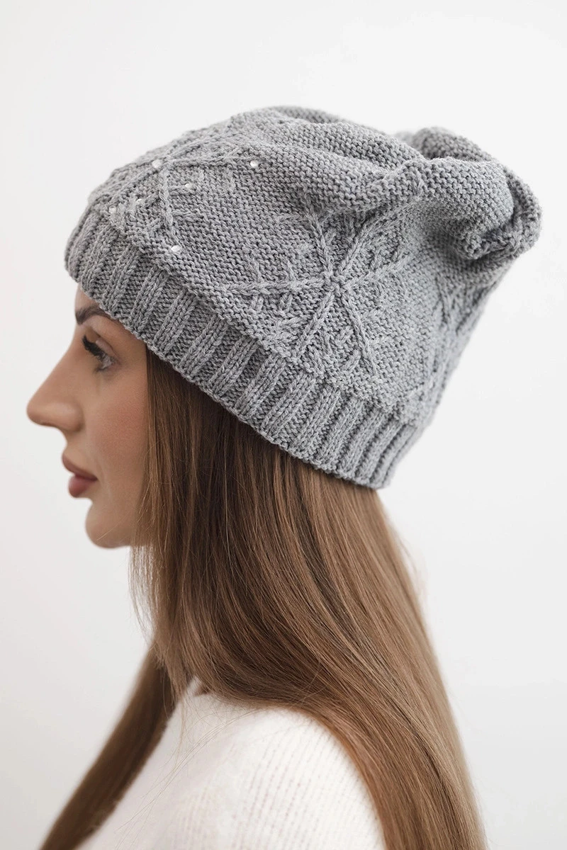 Dámská zimní čepice s příměsí vlny je spojení elegance a každodenního pohodlí. Model se vyznačuje dekorativním, vyvýšeným pletením s geometrickým vzorem, který je ozdoben jemnými perlami. Celkově vypadá žensky a stylově, přitahuje pozornost a zároveň zachovává klasickou formu ideální na každý den.