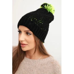 Dámská zimní čepice s vlnou v ozdobném pletení s bambulí K467 černá