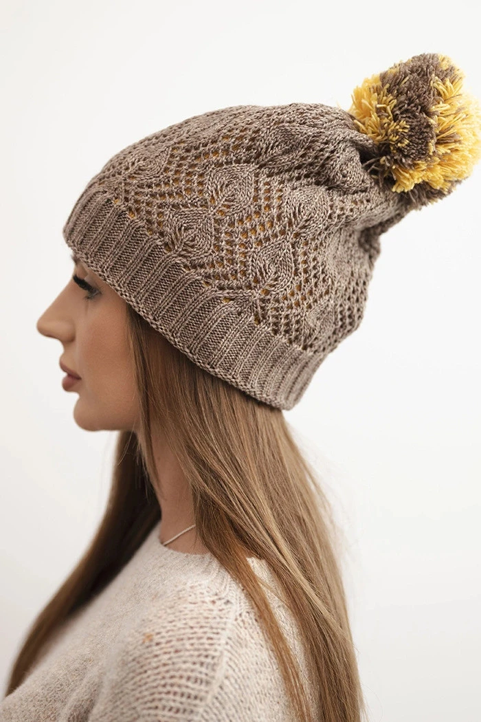 Dámská zimní čepice s vlnou v ozdobném pletení s bambulí K467 mocca