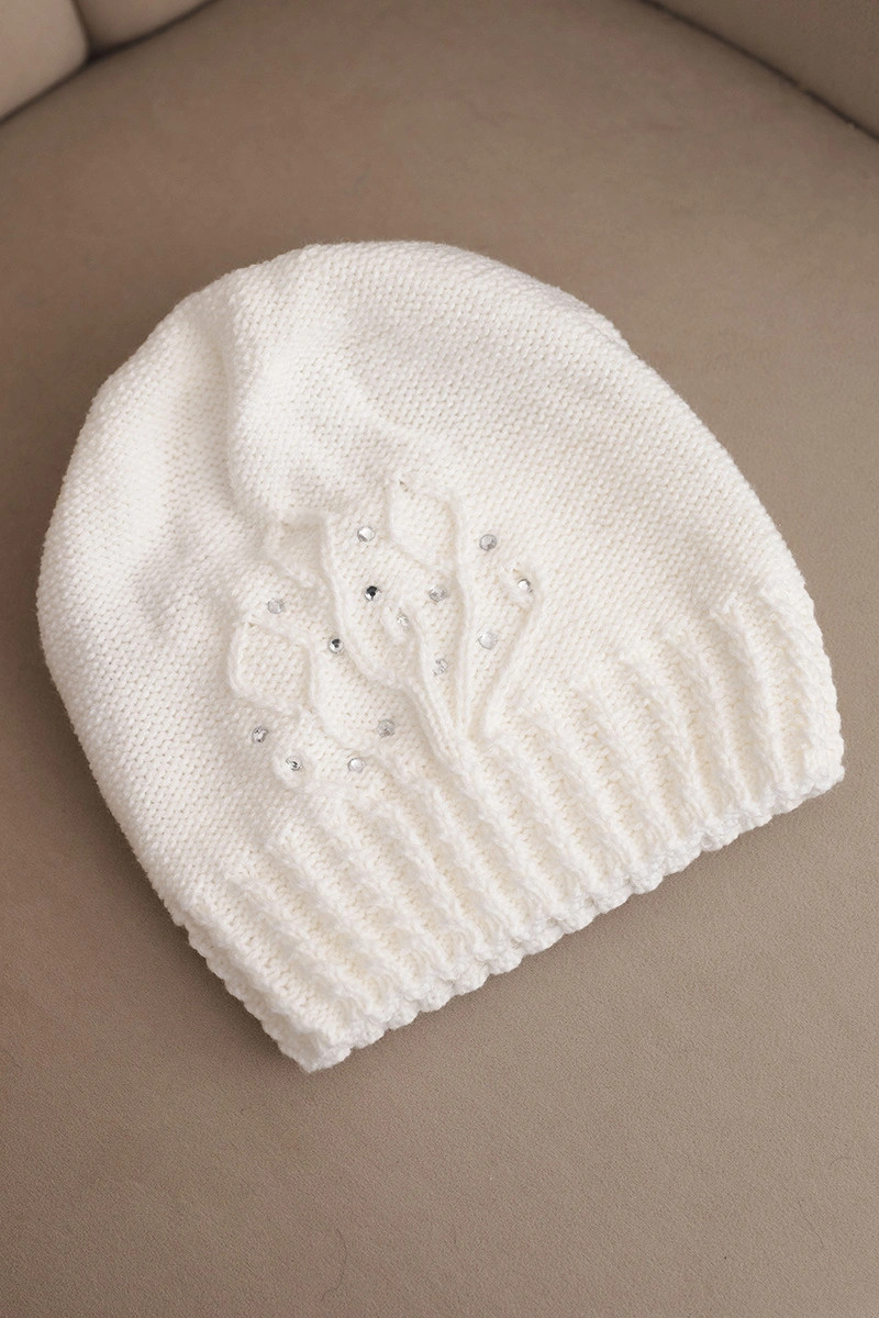 Dámská zimní čepice s vlnou zdobená flitry a pletením K473 bílá