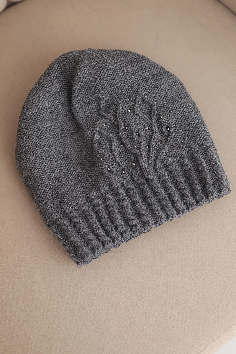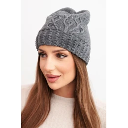 Dámská zimní čepice s vlnou zdobená flitry a pletením K473 grafitová