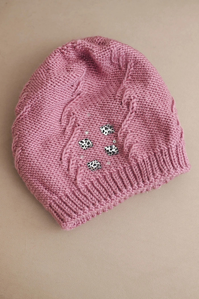 Model se vyznačuje jemnými ozdobami – lesklými aplikacemi a dekorativním pletením, které dodávají kouzlo a ženský charakter. Elastický náplet dobře přiléhá k hlavě, zajišťuje komfort nošení bez tlaku. Ideální volba jak na každodenní nošení, tak k elegantnějším zimním stylizacím.