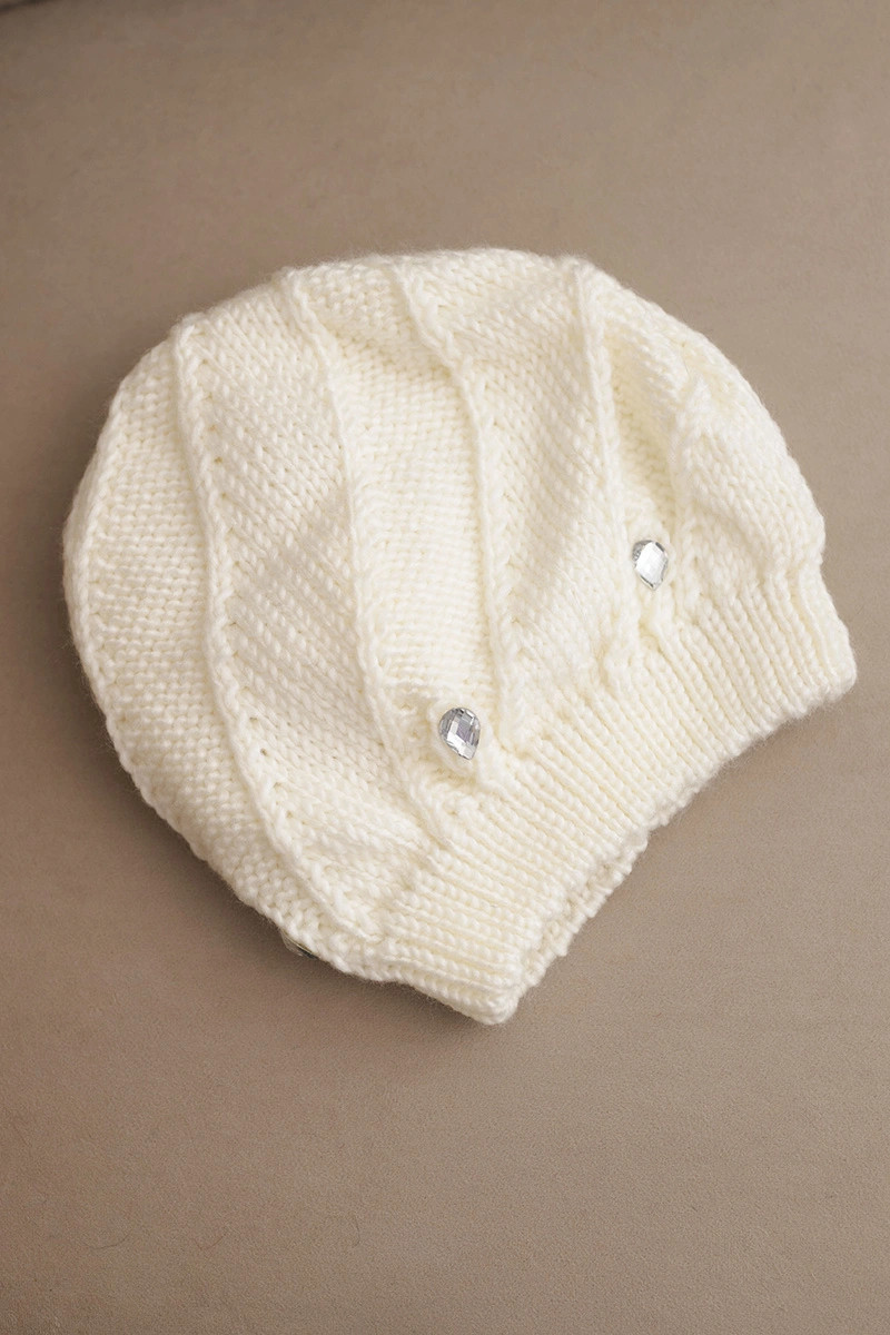 Stylová dámská čepice na zimu, vyrobená z měkké a teplé pleteniny s přídavkem přírodní vlny. Její klasický střih byl obohacen jemným, strukturovaným vzorem a delikátními, lesklými krystaly, které dodávají celku eleganci a ženské kouzlo.