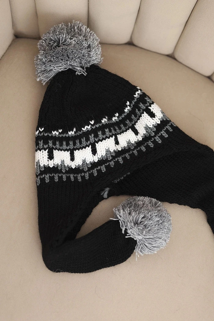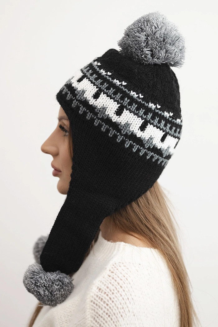 Teplá zimní čepice s efektním vzorem a třemi měkkými pompony – na vrchu a na koncích uší. Skvěle chrání před zimou, zakrývá také uši. Ideální na procházky, zimní výlety a každodenní stylizace.