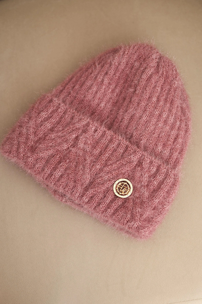 Dámská zimní čepice z huňaté pleteniny a s model 21441822 knoflíkem tmavě růžová - K-Fashion