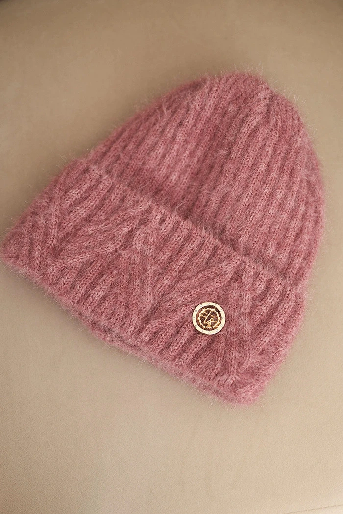 Čepice je ozdobena elegantním zlatým knoflíkem vpředu, který jí dodává jedinečný charakter. Jemná pastelová barva se skvěle hodí do ženských zimních stylizací.
