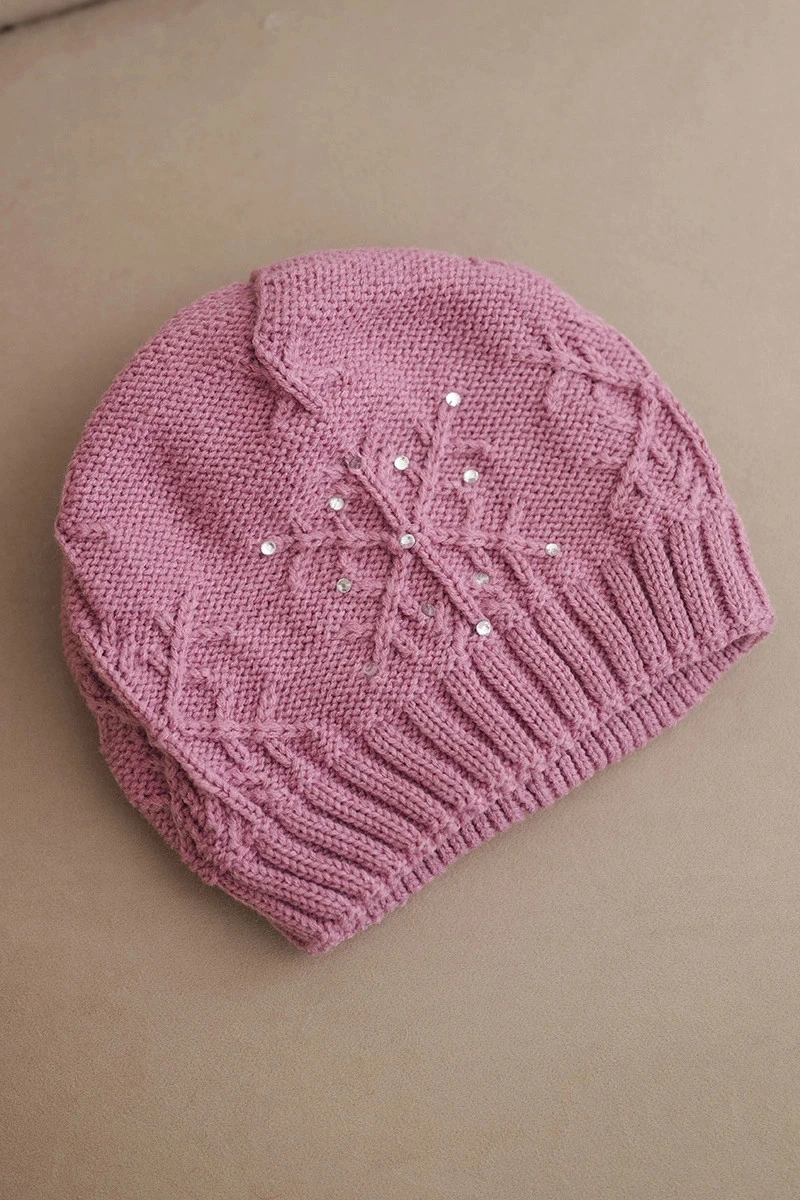 Dámská zimní čepice z vlny a dekorativním pletením s perličkami K470 tmavě růžová