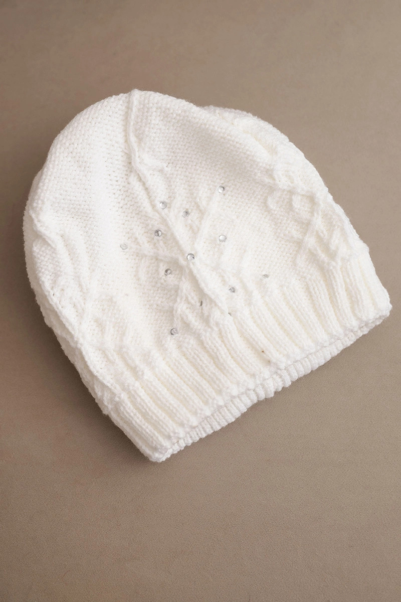 Dámská zimní čepice z vlny a ozdobným pletením s perličkami model 21783055 bílá - K-Fashion