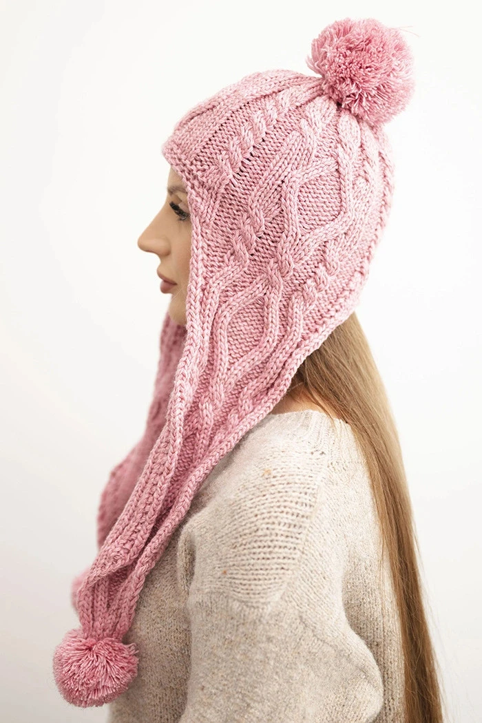 Dámská zimní čepice z vlny s bambulemi a prodlouženými boky K448 růžová