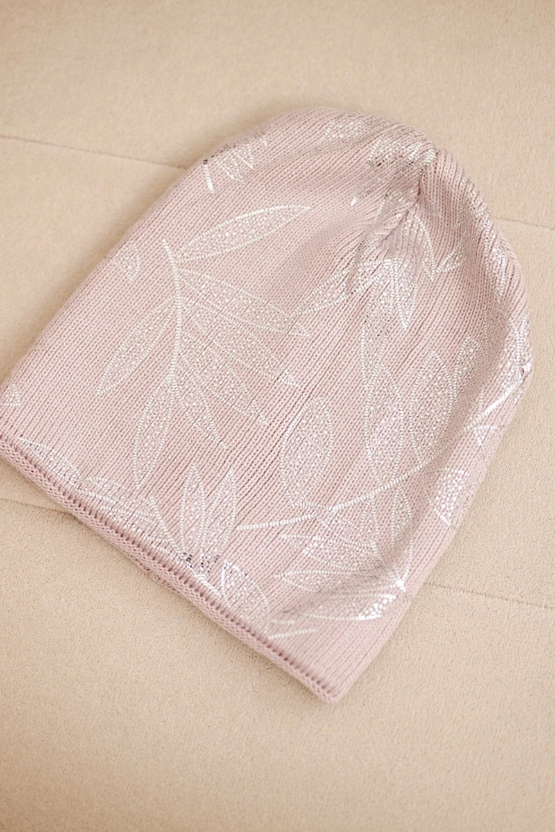 Stylová dámská čepice s jemným leskem, vyrobená z vysoce kvalitní pleteniny s přídavkem mohairu a vlny. Zlatý, rostlinný vzor přitahuje pozornost a dodává eleganci, díky čemuž je čepice ideální jak na každodenní nošení, tak jako módní akcent k zimním stylizacím.