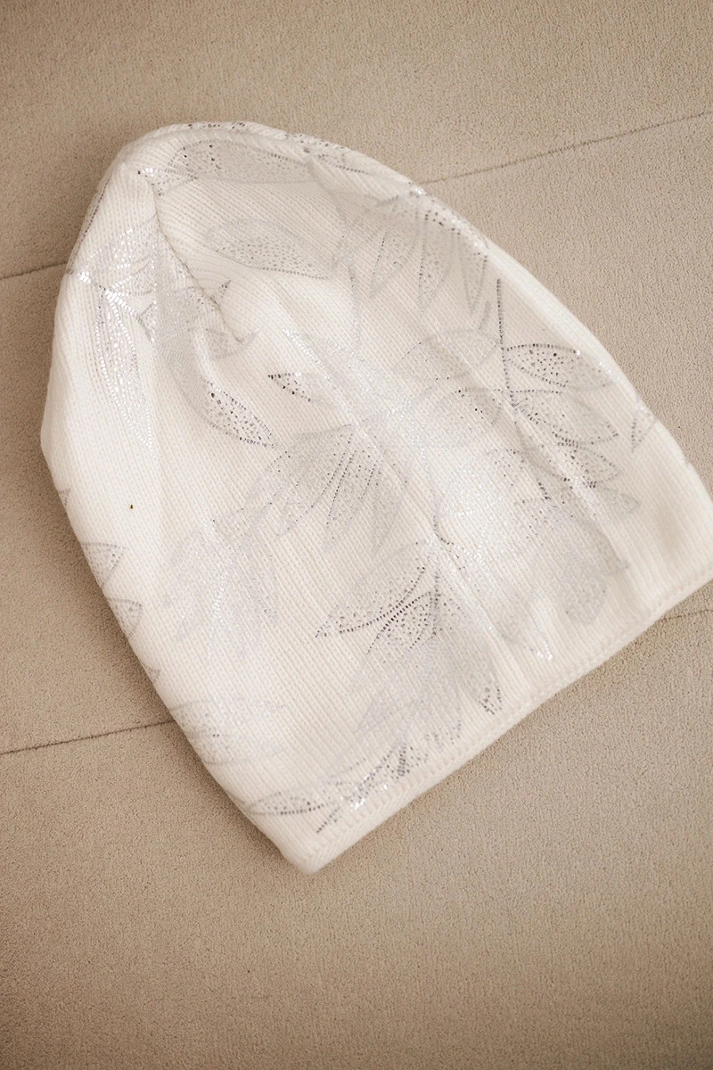 Stylová dámská čepice s jemným leskem, vyrobená z vysoce kvalitní pleteniny s přídavkem mohairu a vlny. Zlatý, rostlinný vzor přitahuje pozornost a dodává eleganci, díky čemuž je čepice ideální jak na každodenní nošení, tak jako módní akcent k zimním stylizacím.