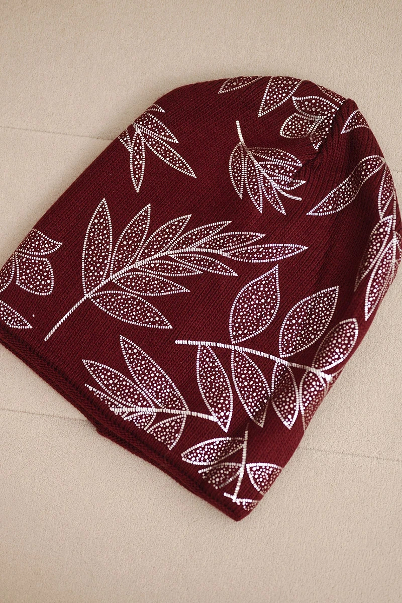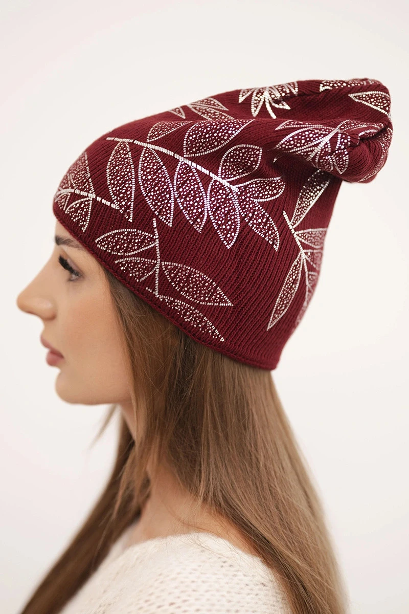 Stylová dámská čepice s jemným leskem, vyrobená z vysoce kvalitní pleteniny s přídavkem mohairu a vlny. Zlatý, rostlinný vzor přitahuje pozornost a dodává eleganci, díky čemuž je čepice ideální jak na každodenní nošení, tak jako módní akcent k zimním stylizacím.