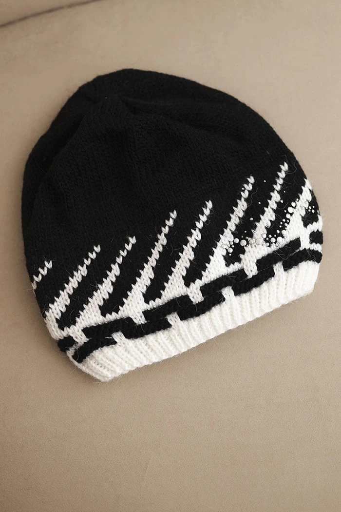 Dámská zimní čepice z vlny s geometrickým vzorem a kamínky K469 černá