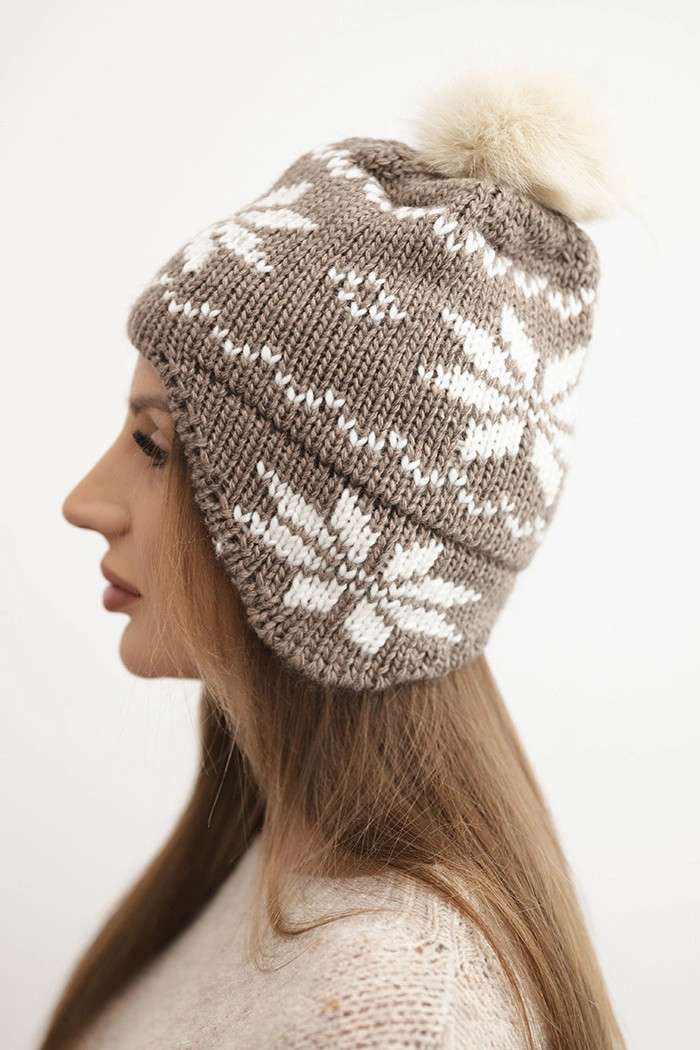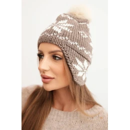 Dámská zimní čepice z vlny s motivem sněhové vločky a pomponem K450 mocca