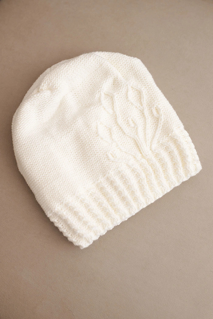 Teplá dámská čepice vyrobená z měkké pleteniny s přídavkem přírodní vlny. Model je zdoben elegantním, vyvýšeným vzorem připomínajícím větvičky, který jí dodává jedinečný půvab. Široký lem zajišťuje dobré přizpůsobení hlavě a pohodlí nošení v chladných dnech.