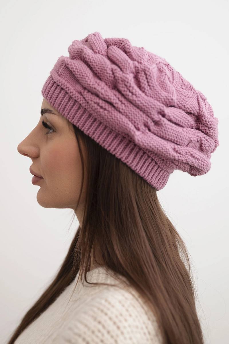 Dámská zimní čepice z vlny s ozdobným pletením a kamínky K397 fialová