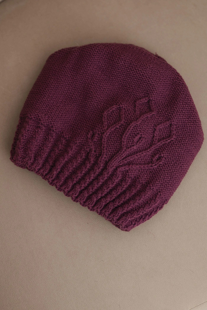 Teplá dámská čepice vyrobená z měkké pleteniny s přídavkem přírodní vlny. Model je zdoben elegantním, vyvýšeným vzorem připomínajícím větvičky, který jí dodává jedinečný půvab. Široký lem zajišťuje dobré přizpůsobení hlavě a pohodlí nošení v chladných dnech.