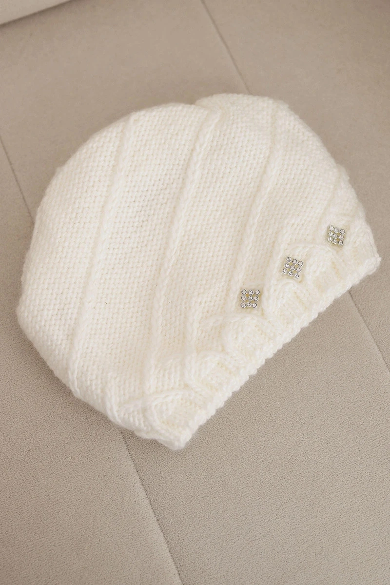 Dámská zimní čepice z vlny s ozdobnými zirkony a pleteným vzorem model 21878081 bílá - K-Fashion