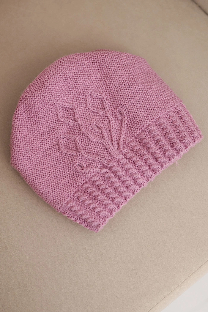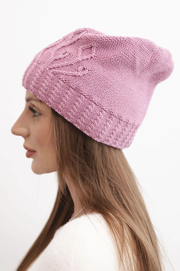 Teplá dámská čepice vyrobená z měkké pleteniny s přídavkem přírodní vlny. Model je zdoben elegantním, vyvýšeným vzorem připomínajícím větvičky, který jí dodává jedinečný půvab. Široký lem zajišťuje dobré přizpůsobení hlavě a pohodlí nošení v chladných dnech.