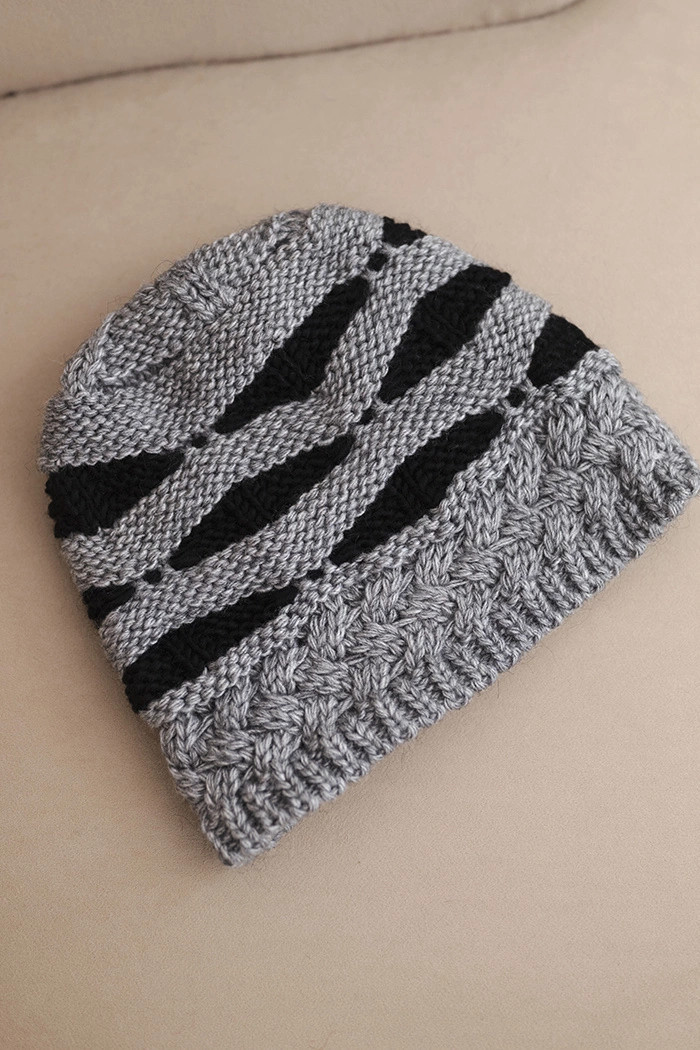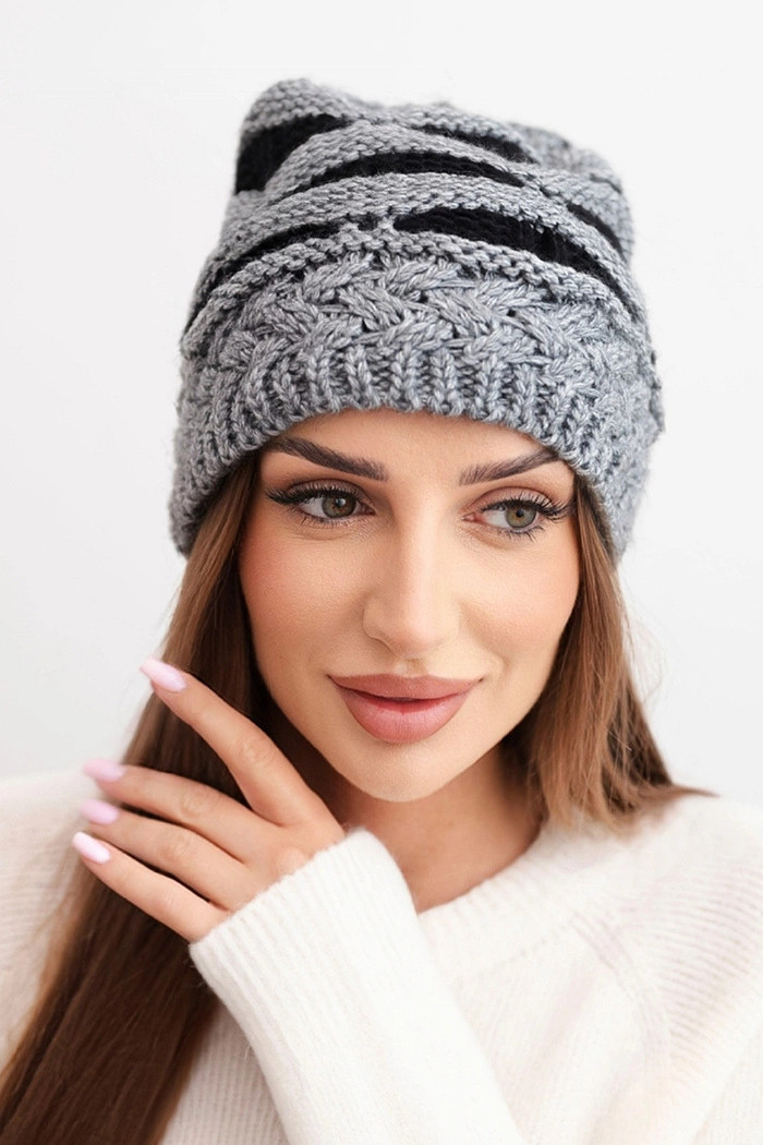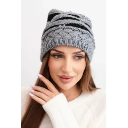 Přidání recenze k Dámská zimní čepice z vlny v hrubém pletení a pruhy K465 šedá + černá