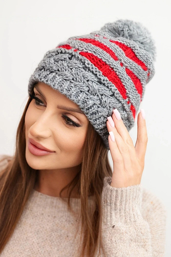 Dámská zimní pletená čepice s bambulí a copánkovým vzorem K466 šedá