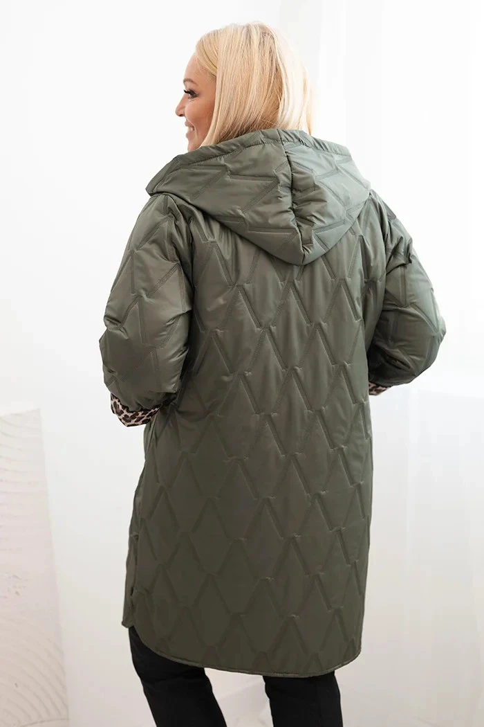 • Dámská zimní prošívaná bunda Plus Size s podšívkou v leopardím vzoru a kapucí khaki