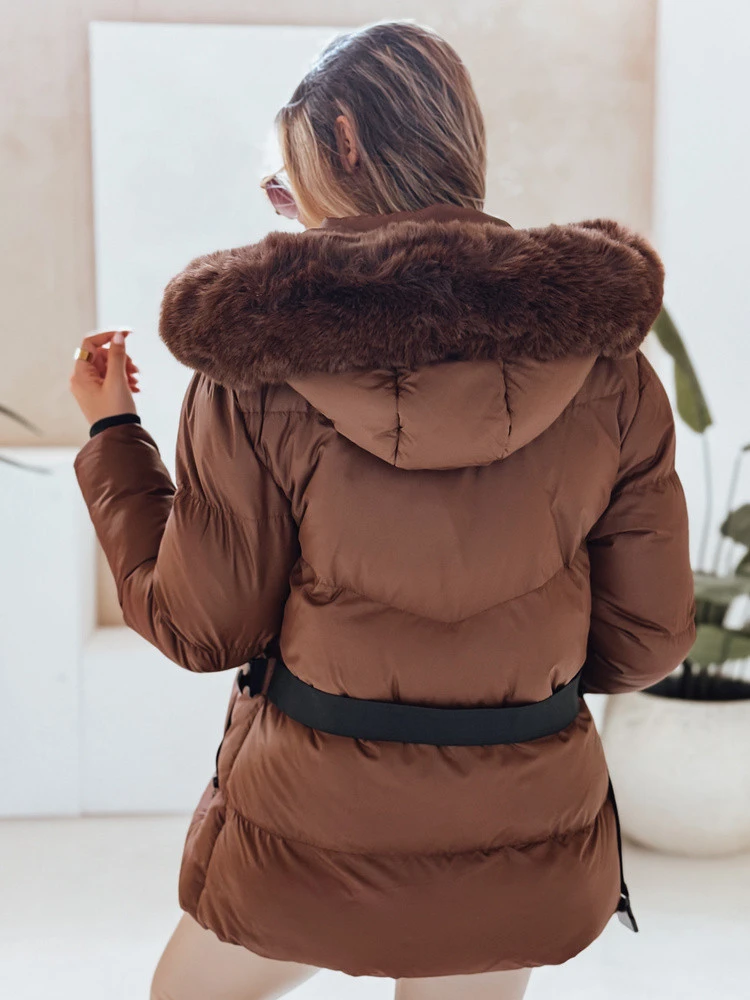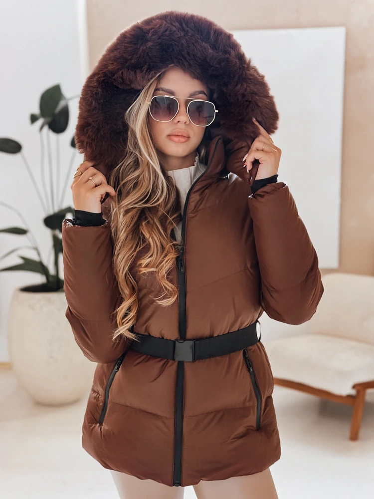 Dámská zimní bunda s páskem zvýrazňujícím pas a velkou měkkou kapucí lemovanou umělou kožešinou. Poskytuje tepelný komfort a je skvělá pro chladné dny. Módní prošívání a funkční kapsy vytvářejí moderní, ženský vzhled pro zimní období.