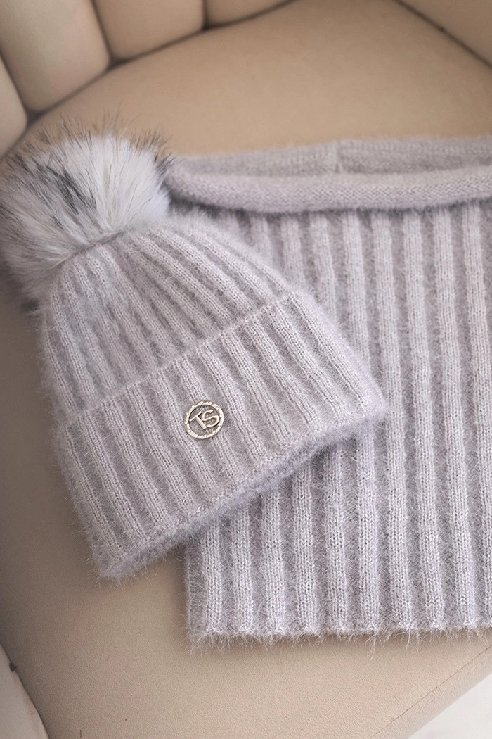 Stylový a praktický zimní set pro ženy – čepice s efektním velkým pomponem a měkký nákrčník. Vyrobeno z příjemného na dotek, nadýchaného úpletu s jemným leskem. Zajišťuje tepelný komfort a módní vzhled v chladných dnech.