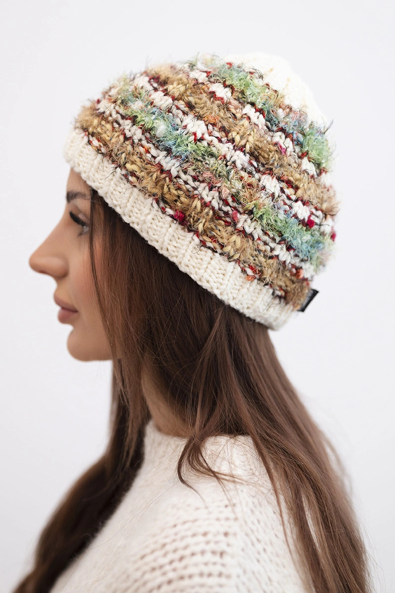 Stylová dámská čepice na zimu vyrobená z barevné, nadýchané příze s jedinečným vzhledem. Kombinace různých textur a barev jí dodává módní, pozornost přitahující charakter. Silný pletený vzor a elastický náplet zajišťují pohodlí nošení a účinnou ochranu před zimou a větrem.