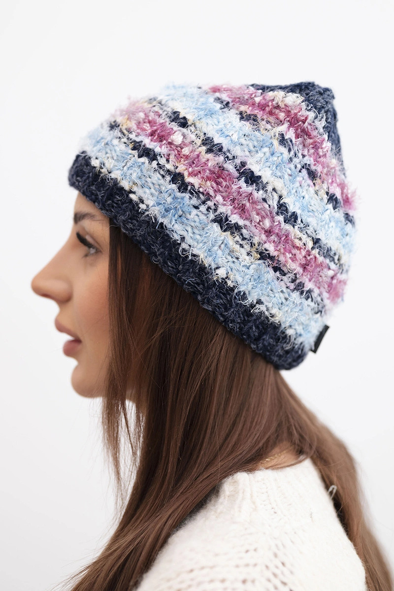 Stylová dámská čepice na zimu vyrobená z barevné, nadýchané příze s jedinečným vzhledem. Kombinace různých textur a barev jí dodává módní, pozornost přitahující charakter. Silný pletený vzor a elastický náplet zajišťují pohodlí nošení a účinnou ochranu před zimou a větrem.