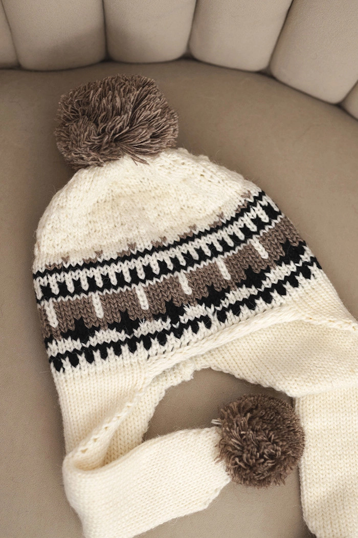 Teplá zimní čepice s efektním vzorem a třemi měkkými pompony – na vrchu a na koncích uší. Skvěle chrání před zimou, zakrývá také uši. Ideální na procházky, zimní výlety a každodenní stylizace.