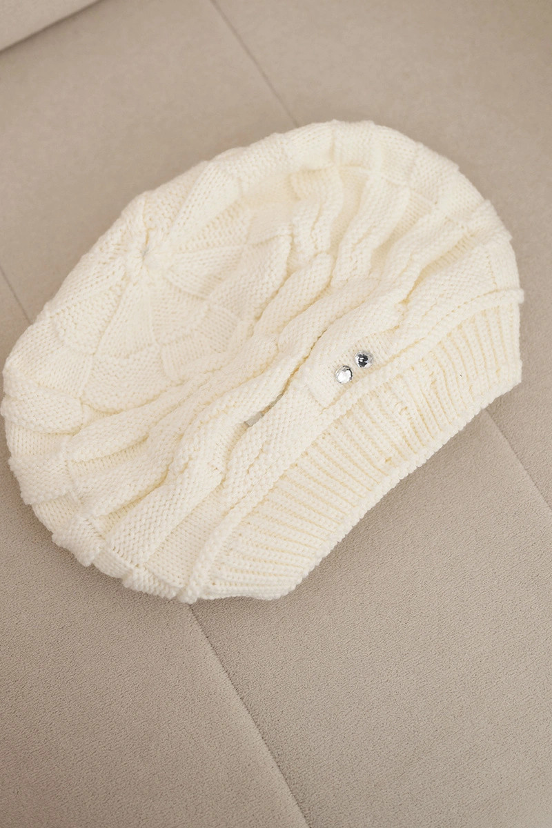 Dámská zimní vlněná čepice se zdobnými krystaly K399 ecru