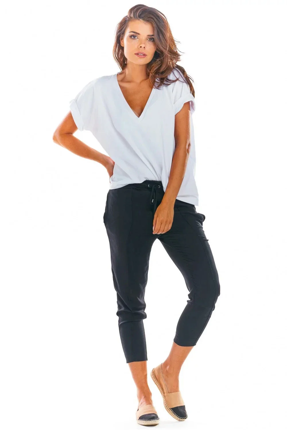 Elegantní cigaretové kalhoty na míru s nařaseným volánem v pase. Perfektní pro každodenní nošení, skvěle vypadá s elegantními letními jehlovými podpatky. Můžete je nosit také s tričkem a espadrilkami. Vyrobeno ze splývavé tkaniny.
