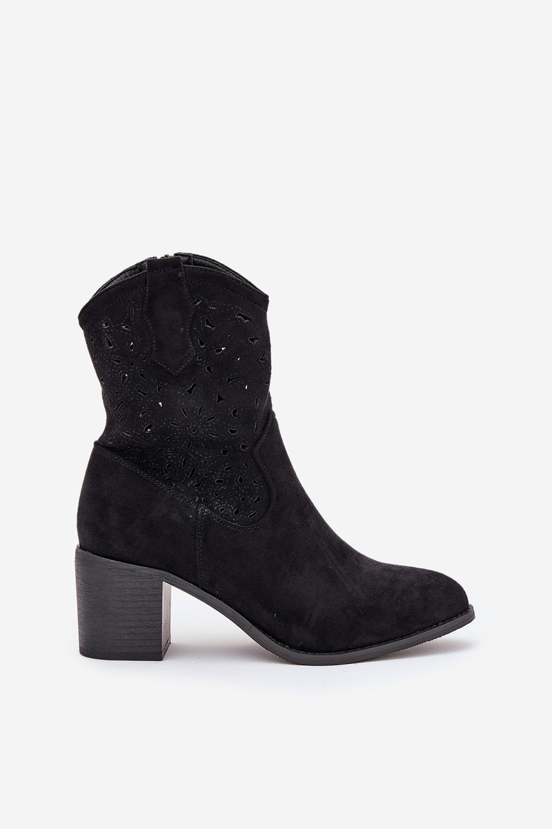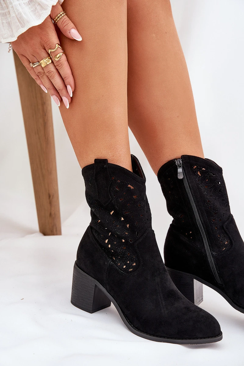 Stylové dámské boty vyrobené z vysoce kvalitního eko semiše. Uloženy na stabilním sloupkovém podpatku. Tento model vyniká perforovaným vzorem na svršku. Špičky mají mandlový tvar. Zapínání na zip zajišťuje pohodlí a snadné obouvání. Ideální na různé příležitosti, tyto boty budou stylovým doplňkem vašeho jarního šatníku. Při výběru velikosti se řiďte tabulkou velikostí.