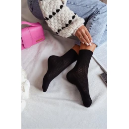 Černé dámské azurové ponožky jsou měkké, pohodlné a ideální pro každodenní nošení. Lehký a prodyšný vzor dodává ponožkám elegantní vzhled a příjemný pocit na noze. Černá barva je nadčasová, univerzální a snadno kombinovatelná s různou obuví a outfity.