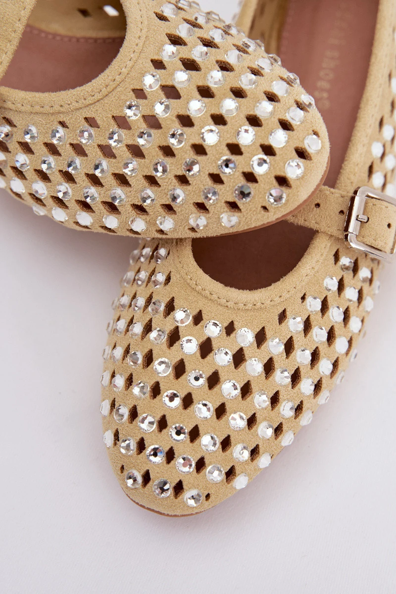 Dámské baleríny z eko semiše jsou stylovou volbou na teplé dny. Otevřená svršek zdobená kamínky jim dodává jemný lesk. Pásek s přezkou na nártu zajišťuje dobré přizpůsobení a zdůrazňuje ženský charakter modelu. Zaoblené špičky doplňují klasický střih, takže baleríny se skvěle hodí jak na každodenní nošení, tak na elegantnější příležitosti. Při výběru velikosti se řiďte tabulkou velikostí.