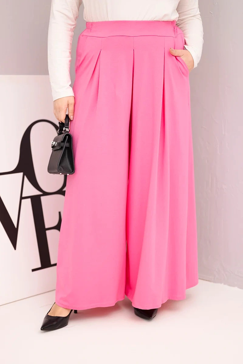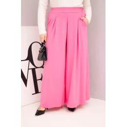 Stylové a nesmírně pohodlné dámské kalhoty Plus Size s širokým, vzdušným nohavicím jsou ideální nabídkou pro dámy, které si cení pohodlí a módního, lehce oversize stylu. Díky velmi širokému střihu se kalhoty krásně pohybují během pohybu, vytvářejí efekt maxi sukně, a elastický pas zajišťuje dokonalé přizpůsobení bez tlaku.