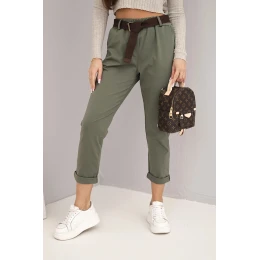Dámské bavlněné kalhoty s páskem a ohrnutým lemem khaki