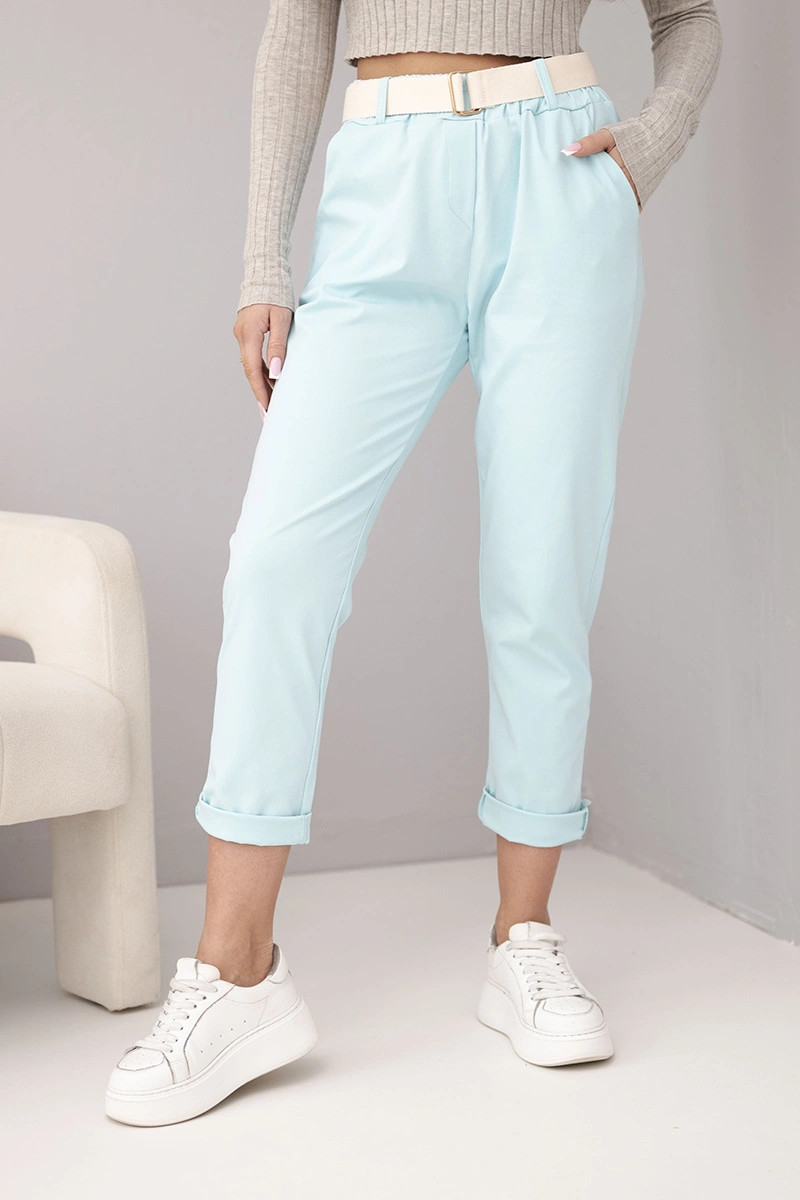 Dámské bavlněné kalhoty s páskem a ohrnutým nohavicí mátové