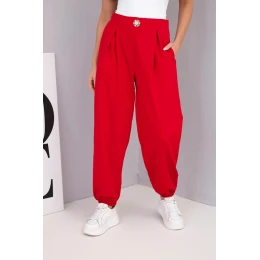 Dámské bavlněné kalhoty s vysokým pasem a ozdobným knoflíkem červené