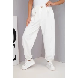 Dámské bavlněné kalhoty s vysokým pasem a ozdobným knoflíkem ecru
