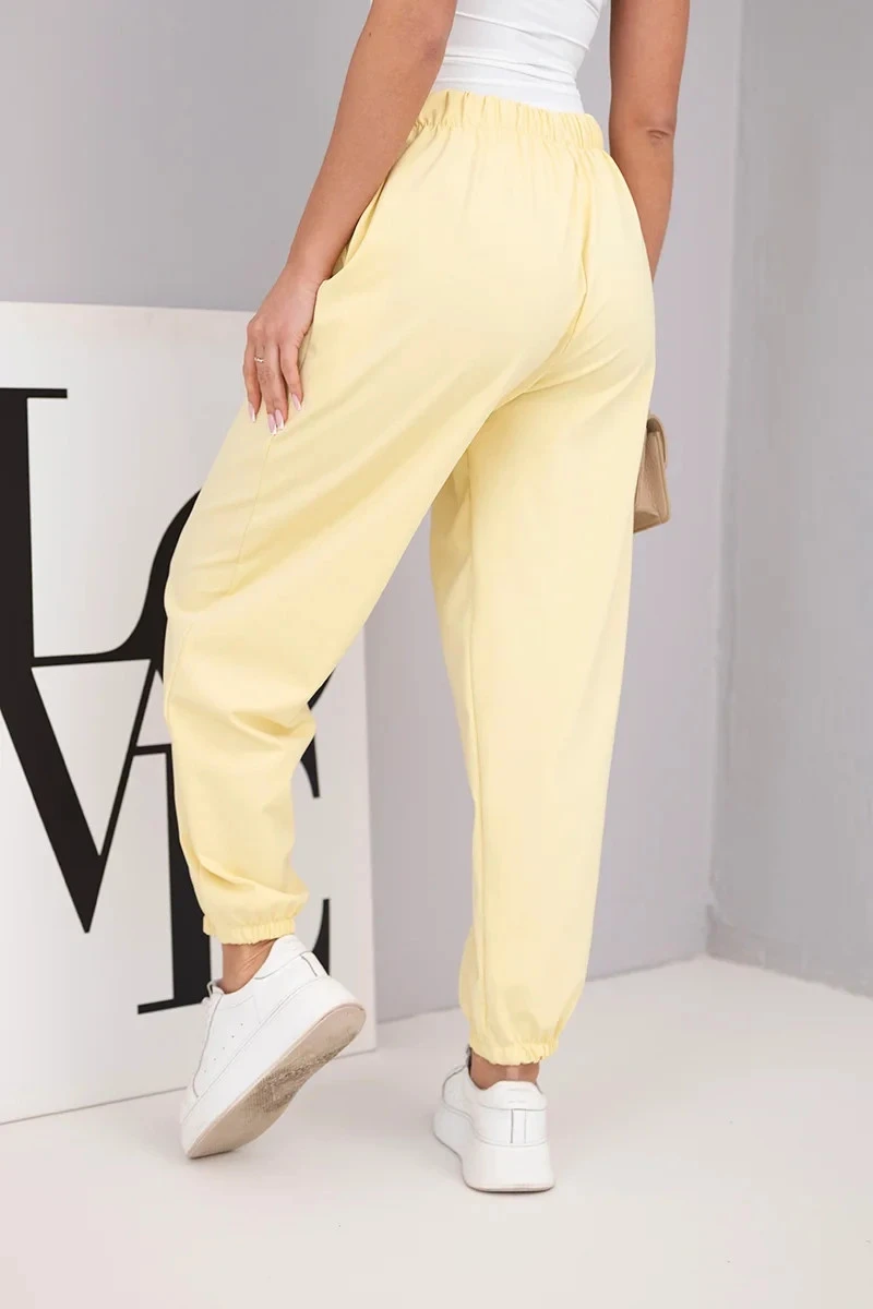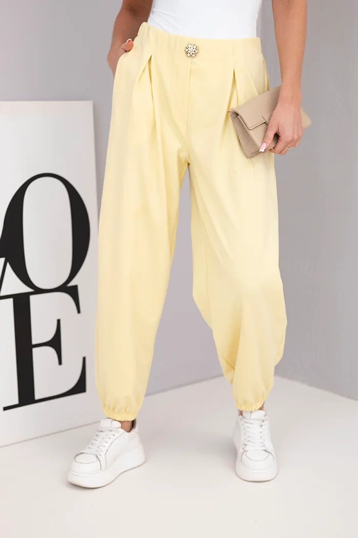 Dámské bavlněné kalhoty s vysokým pasem a ozdobným knoflíkem žluté