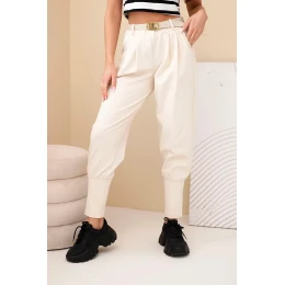 Dámské bavlněné kalhoty s vysokým pasem a páskem béžová