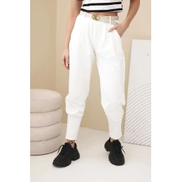 Dámské bavlněné kalhoty s vysokým pasem a páskem ecru