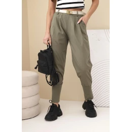 Dámské bavlněné kalhoty s vysokým pasem a páskem khaki