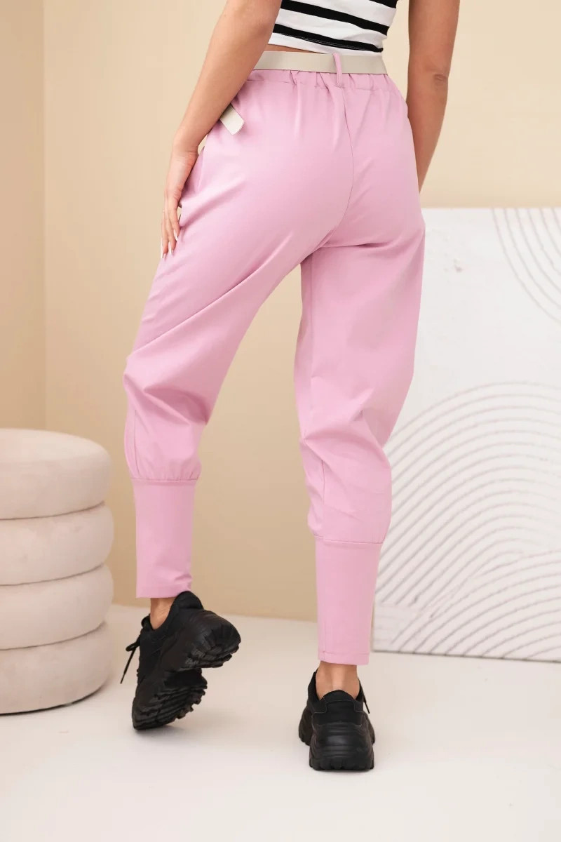 Dámské bavlněné kalhoty s vysokým pasem a páskem tmavě růžové