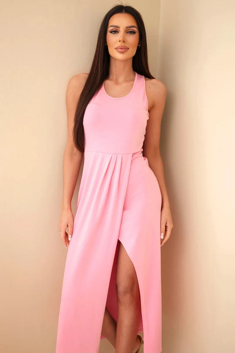 Dámské bavlněné midi šaty bez rukávů s řasením světle růžové