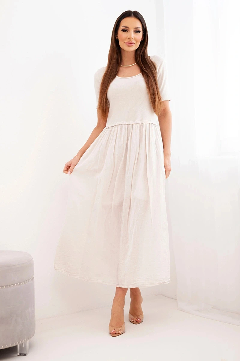 Dámské bavlněné midi šaty s krátkým rukávem a rozšířeným spodkem béžová